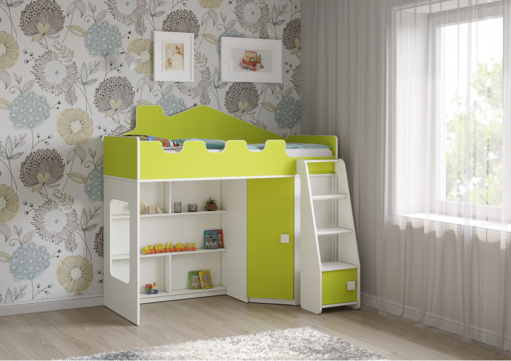 Отличительной особенностью данной модели является наличие прямой лестницы с дверкой, что добавляет элемент игры и позволяет ребенку легко и безопасно подниматься на свое спальное место. Угловой шкаф, расположенный на одном из фасадов кровати, предоставляет достаточно места для хранения одежды, игрушек и других предметов, которые должны быть под рукой.