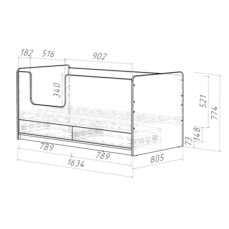 Безопасность ребенка во время сна - это один из главных приоритетов при проектировании данной кровати. Высокие безопасные борта высотой 521 мм обеспечивают надежную защиту от падений, а отсутствие острых углов и мягкий противоударный кант увеличивают безопасность использования кровати.