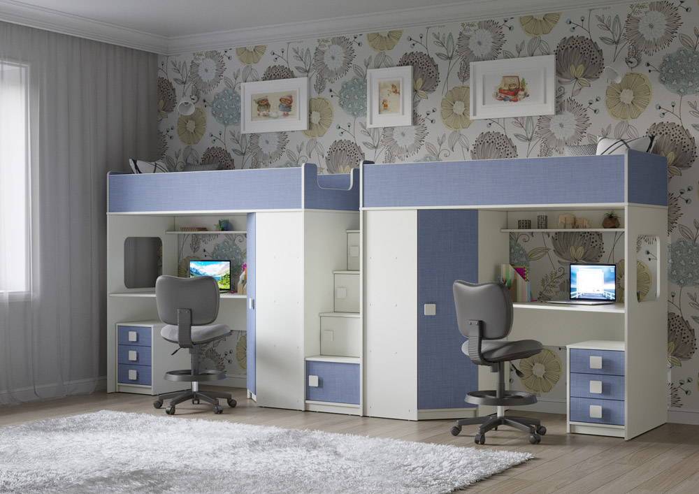Две кровати, два шкафа, две рабочих зоны с тумбами – одна лестница. Идеальный вариант для двоих детей!