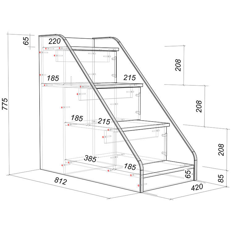 Выдвижная кровать помещается под спальным местом,при необходимости её можно выдвинуть вперед параллельно или перпендикулярно кровати-чердаку.